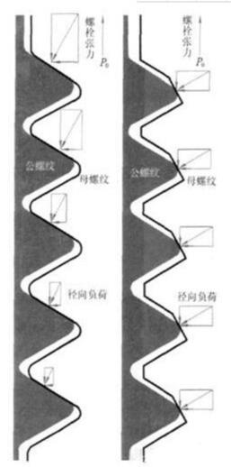 普通螺紋———60°角V形螺紋在其第一螺紋嚙合面和第二螺紋嚙合面承載了70%~80%的負(fù)荷,而以后幾個(gè)嚙合面承受的負(fù)荷很少。這樣一來普通螺紋緊固件在工作振動(dòng)負(fù)荷條件下,就很容易克服螺紋接觸面上的鎖緊力而產(chǎn)生轉(zhuǎn)動(dòng),進(jìn)而松脫,這就是普通螺紋緊固件松脫的原因所在。
